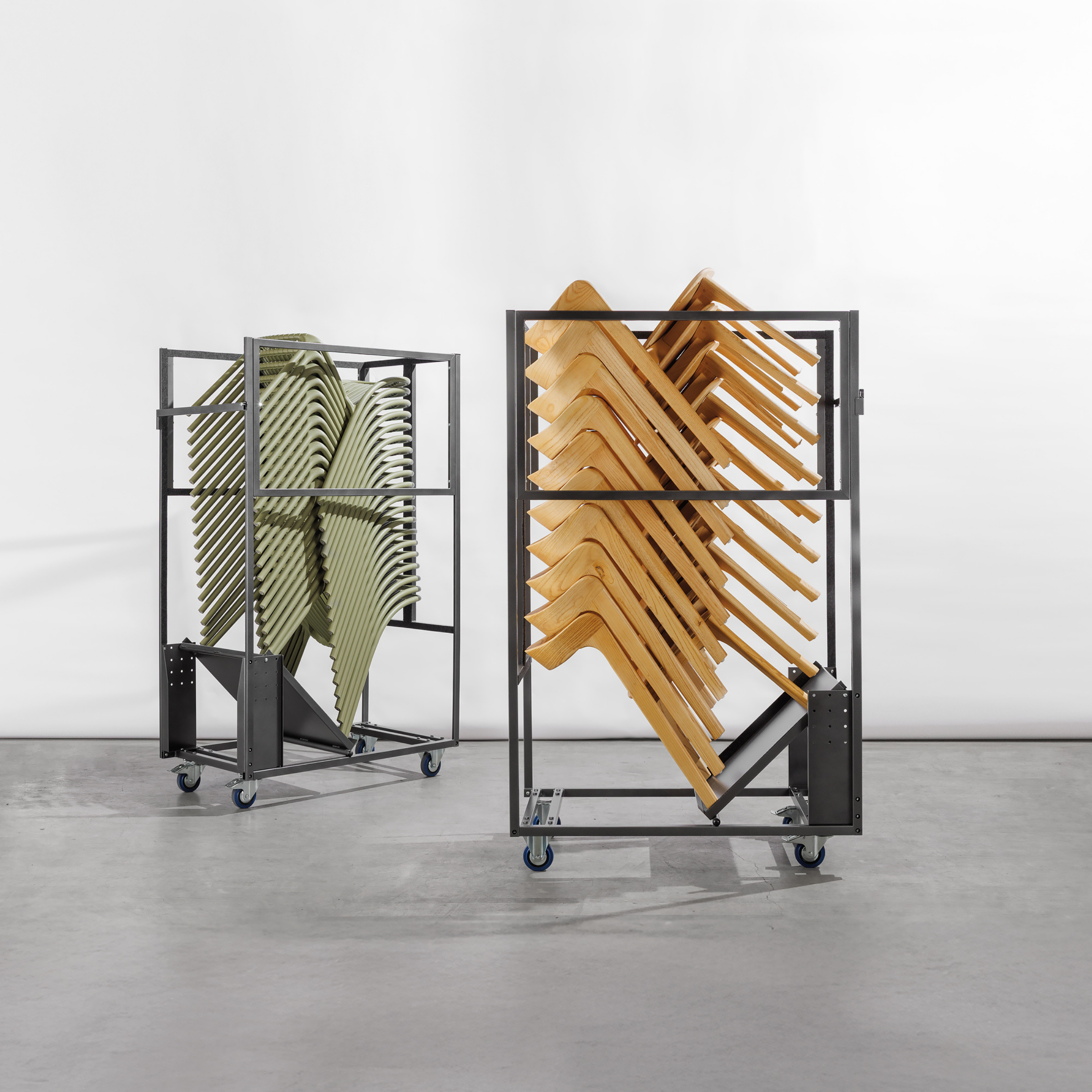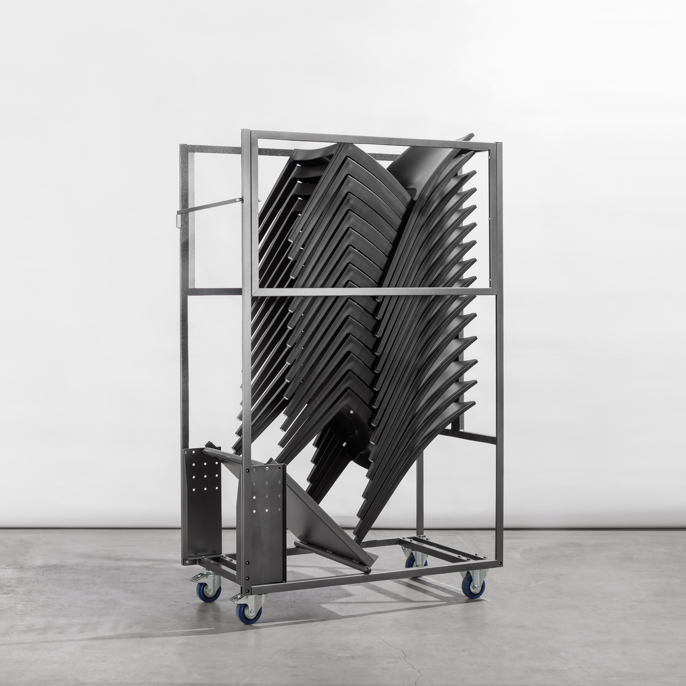 Machen Sie sich mit diesem universellen Transportwagen keine Sorgen um den Transport, die Lagerung und den Schutz Ihrer Stapelstühle. Dieser Transportwagen soll es Ihnen leicht machen! Dank einer verstellbaren Auflageplatte können Sie diese je nach Stapelstuhltyp richtig einstellen, sodass die Stühle gerade gestapelt werden. Je nach Stuhltyp variiert die Stapelbarkeit zwischen 10 und 19 Stück (siehe technisches Datenblatt). Der Transportwagen ist mit vier stabilen vulkanisierten Rädern ausgestattet, davon zwei Lenkräder mit Bremse und zwei Bockräder. Auf diese Weise können Sie mühelos durch verschiedene Räume manövrieren. Für folgende Stapelstühle: Wave, Audrey, Nina, Veneto, Sorrento, Capri, Pepper und Teddy.