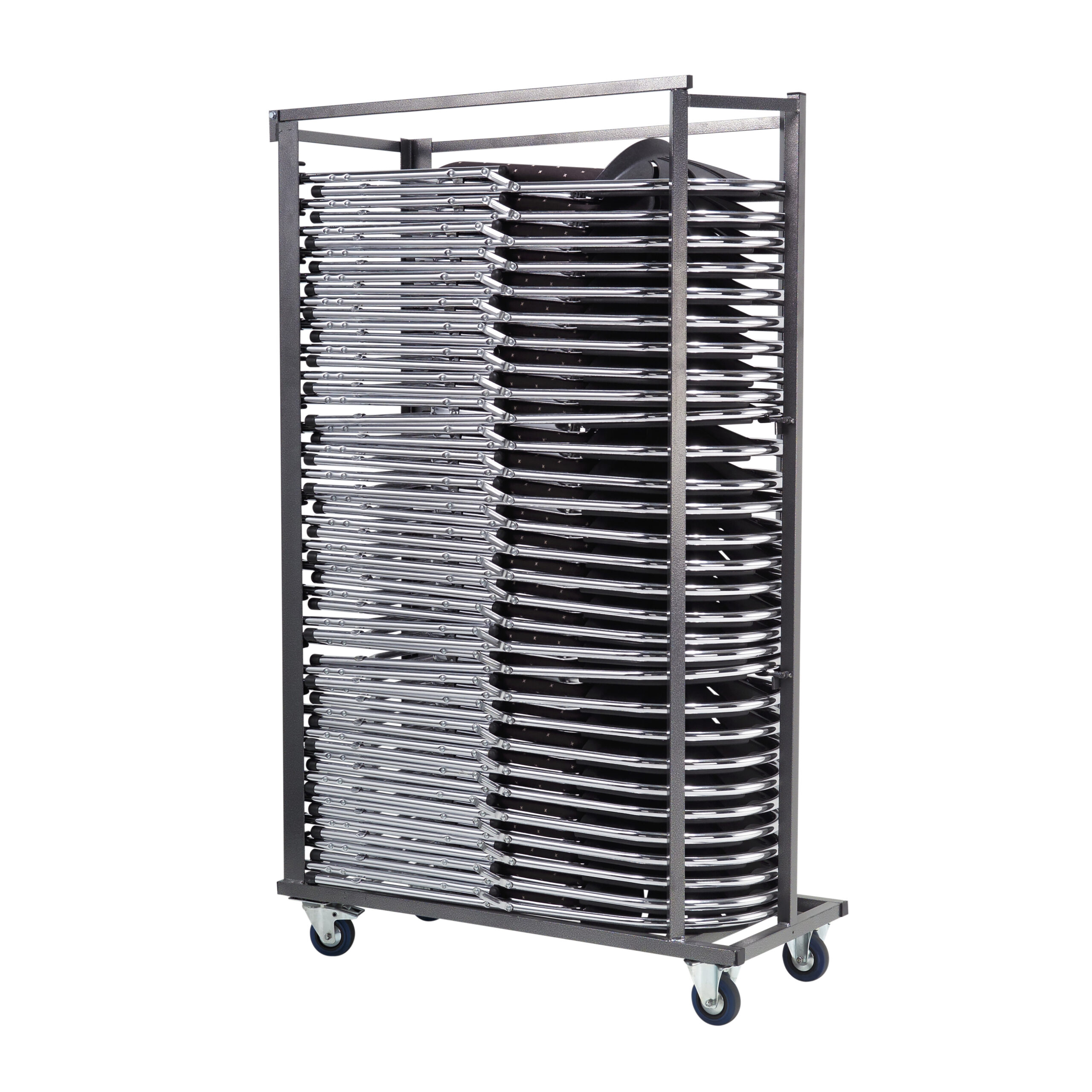 Don't worry about the transport, storage and protection of your Super De Luxe folding chairs with our handy transport cart, for up to 30 pieces. This transport cart is specially designed to make it easy for you! The transport cart is equipped with four sturdy vulcanized wheels, two of which are swivel wheels with brakes and two are fixed wheels. This way you can effortlessly maneuver through different spaces.