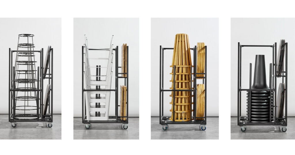Chariots de transport structurez ce processus. Au lieu de déplacer les chaises et les tables une par une, déplacez des volumes plus importants par mouvement : 8 à 10. les tables par chariot, 20 à 30 chaises pliantes, ou jusqu'à 30 chaises empilables et tabourets de bar. Moins de déplacements, moins de distance à parcourir à pied et une mise en place nettement plus progressive.