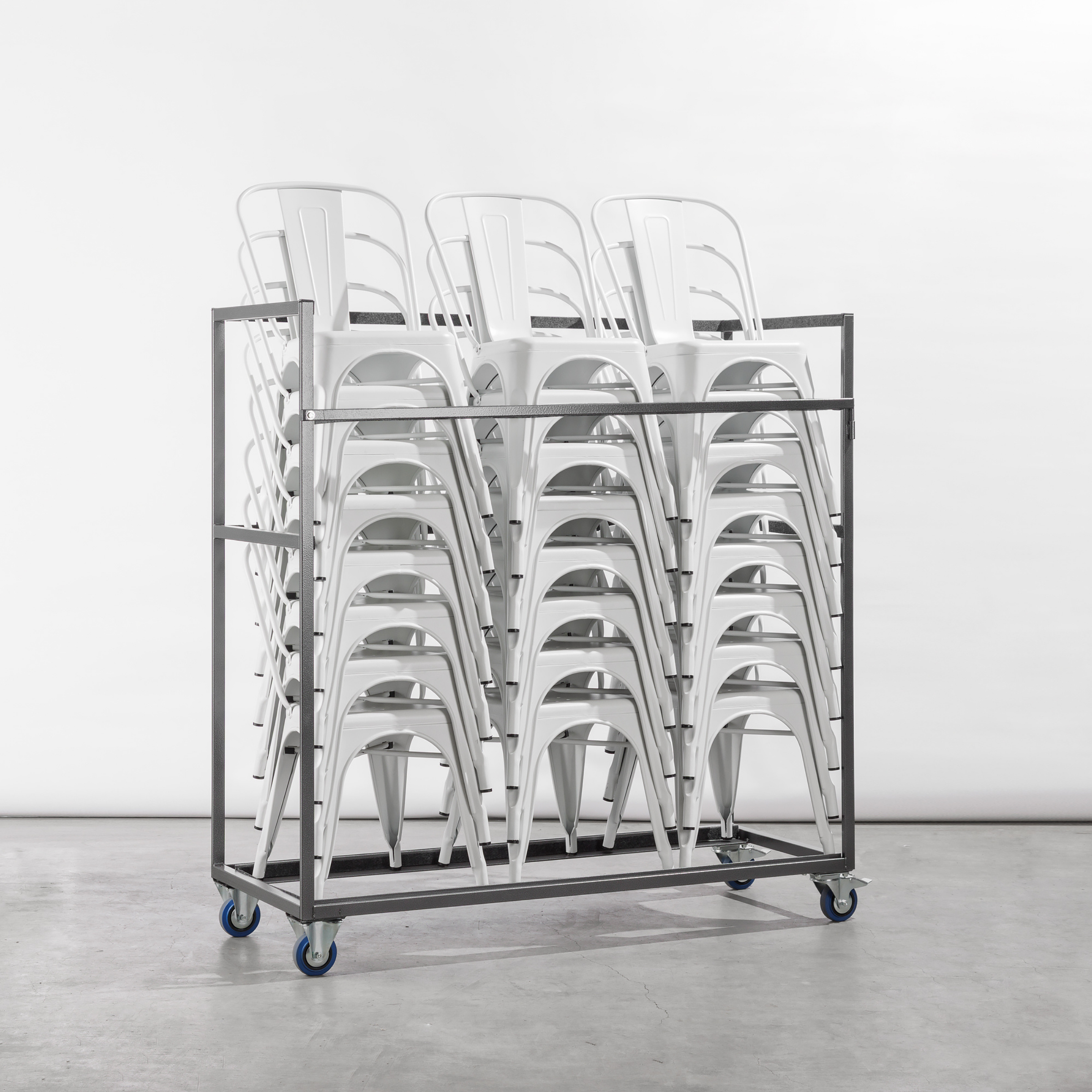 Le chariot de transport Tolix Style Chair transporte 24 chaises empilables Tolix Style : simple et efficace. Les caractéristiques les plus importantes sont un transport et un stockage simplifiés. De plus, il protège également les chaises contre d'éventuels dommages. Le chariot de transport est équipé de 4 roues vulcanisées : 2 roues pivotantes avec freins et 2 roues fixes.